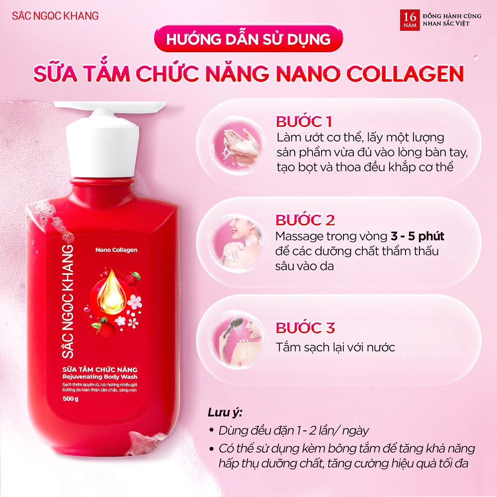 Đừng để làn da của bạn phải chịu “thiệt thòi” thêm nữa! Sữa Tắm Chức Năng Sắc Ngọc Khang sẽ đưa bạn bước vào hành trình chăm sóc da hoàn hảo. Nhờ vào sức mạnh từ công thức độc đáo kết hợp Nano Collagen, chiết xuất Mâm Xôi Đỏ mang đến làn da săn chắc, trắng mịn và tràn đầy sức sống. Đặc biệt, hương nước hoa Cherry Blossom, mang đến mùi hương nhẹ nhàng, quyến rũ, giúp lưu hương dài lâu, làm say mê mọi giác quan, đánh thức từng tế bào.
